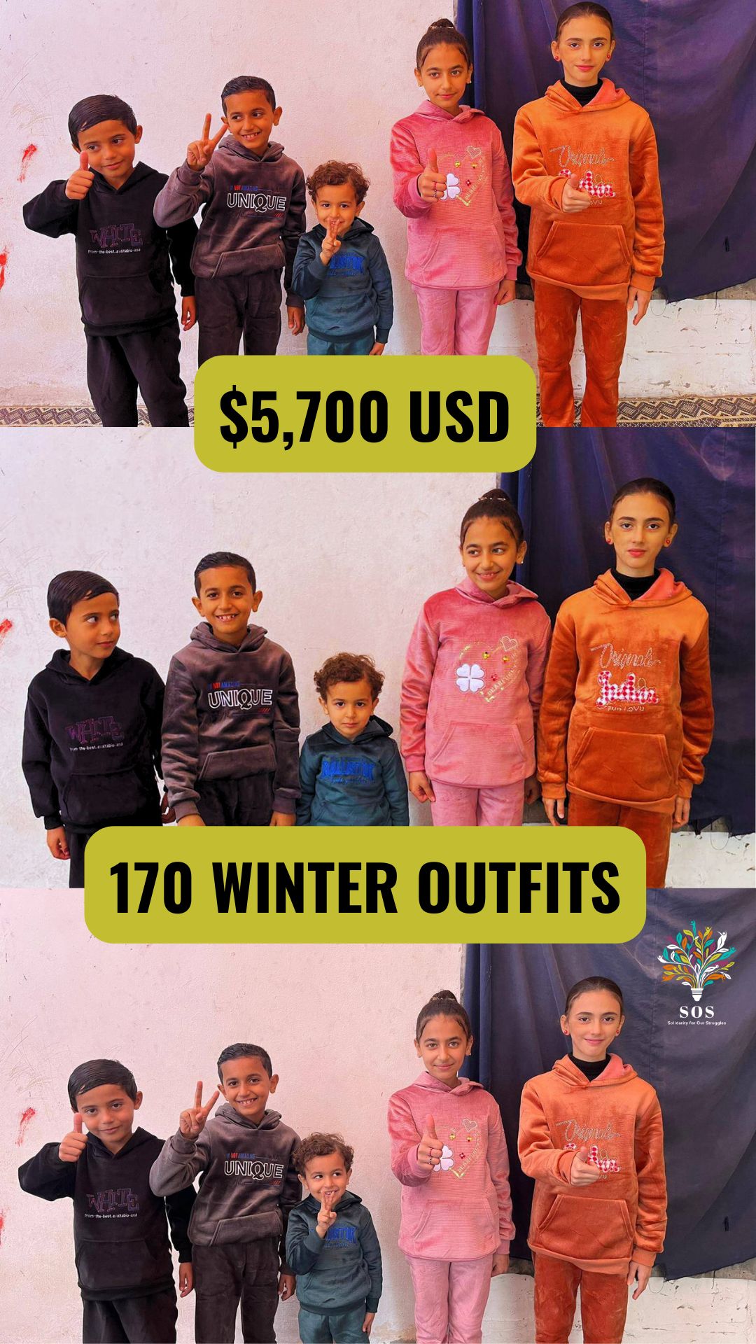 Video description: The video switches between three types of slides. First is a black and white background of pine trees with snow, swaying in the wind. On top is black text on a bright yellow-ish green background that states the content of this post. Second, are pictures of recipients of the winter outfits, wearing them while smiling at the camera, some give peace signs and others thumbs up, while some have a mischievous grin. Finally, intermixed are videos of the winter outfits folded/in packages. They are all different colours and materials.